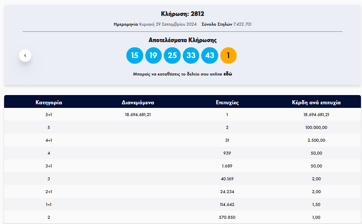 Οι τυχεροί αριθμοί στην κλήρωση Τζόκερ σήμερα είναι οι 15, 19, 25, 33, 43 και τζόκερ ο αριθμός 1.