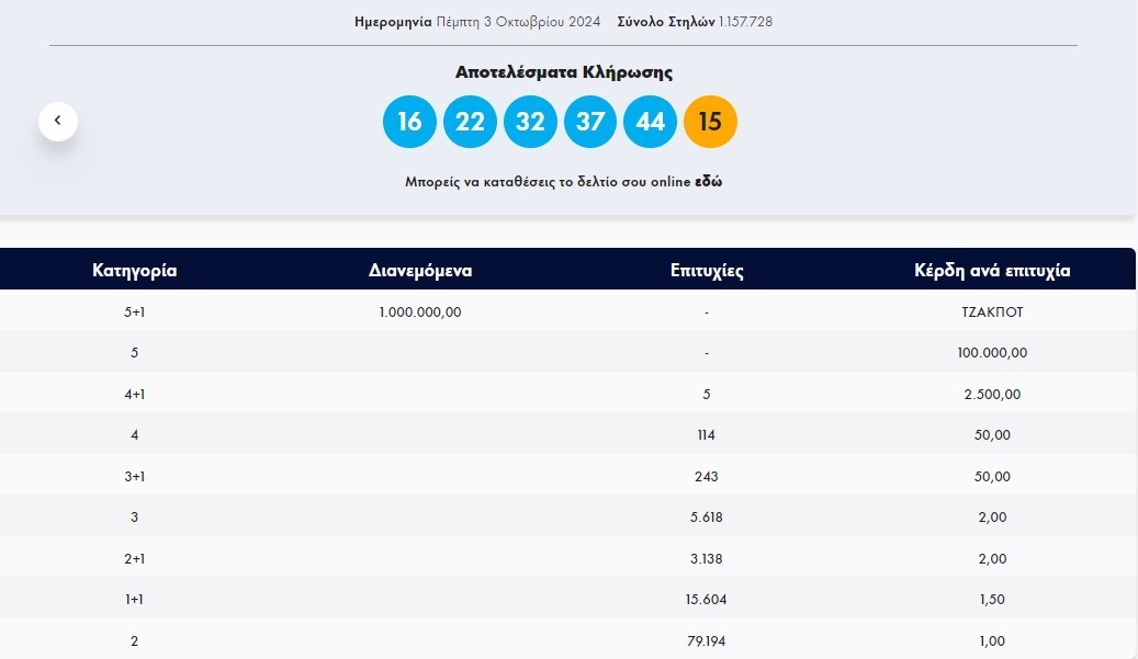 Oλοκληρώθηκε η κλήρωση του Τζόκερ που πραγματοποιήθηκε την Πέμπτη, 3 Οκτωβρίου, με κέρδη άνω του 1 εκατ. ευρώ.