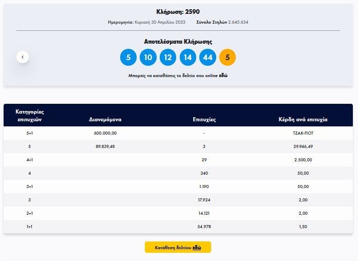 Oλοκληρώθηκε η κλήρωση (2590) του Τζόκερ που πραγματοποιήθηκε την Κυριακή 30 Απριλίου 2023 και μοίραζε €600.000 στους νικητές της πρώτης κατηγορίας.
