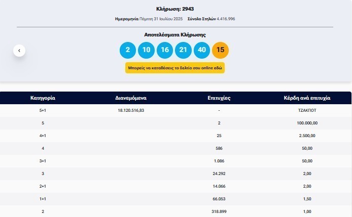 Ολοκληρώθηκε η κλήρωση του τζόκερ που πραγματοποιήθηκε την Πέμπτη, 31 Ιουλίου, με κέρδη πάνω από 18 εκατ. ευρώ.