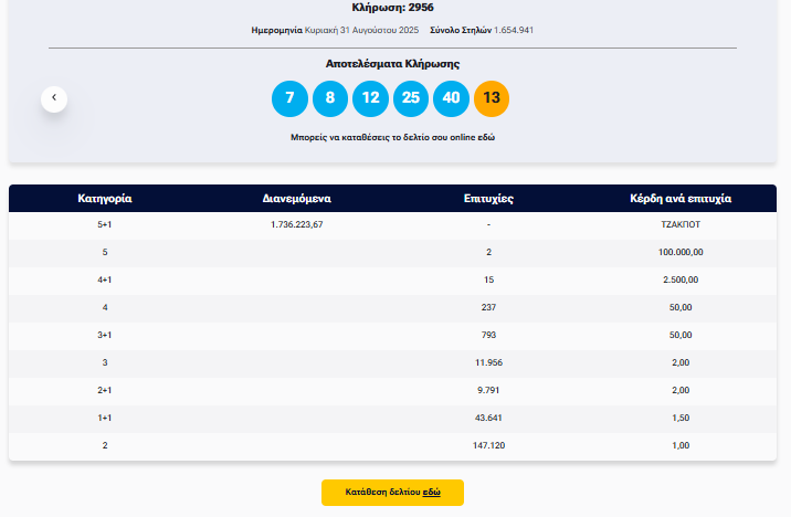 Στην πρώτη κατηγορία σημειώθηκε νέο τζάκποτ!