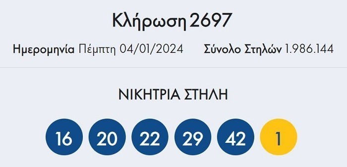 Oλοκληρώθηκε η κλήρωση 2697 του Τζόκερ που πραγματοποιήθηκε την Πέμπτη 4 Ιανουαρίου 2024, με κέρδη τουλάχιστον 3.500.000 ευρώ στην πρώτη κατηγορία.