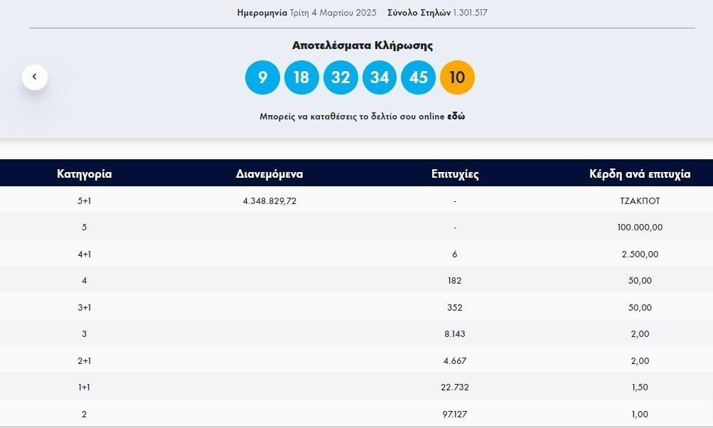 Οι τυχεροί αριθμοί στην κλήρωση Τζόκερ σήμερα είναι: 9, 18, 32, 34, 45 και τζόκερ ο αριθμός 10.