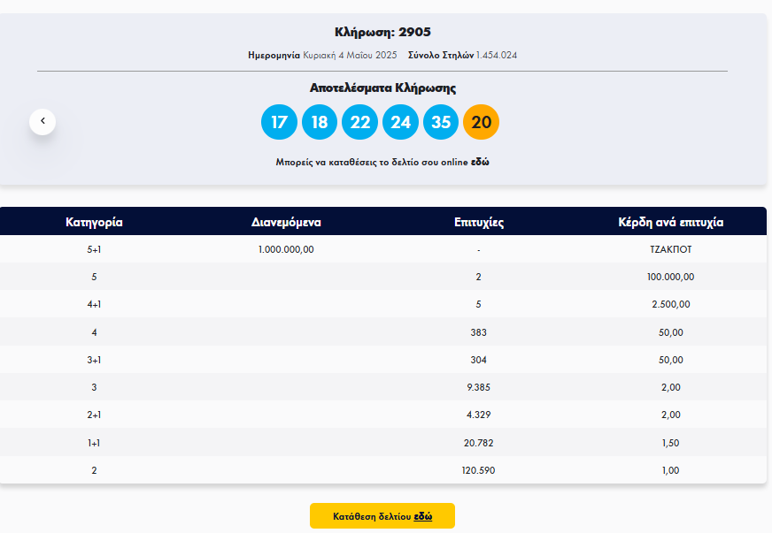Oλοκληρώθηκε η κλήρωση του τζόκερ που πραγματοποιήθηκε την Κυριακή, 4 Μαΐου, με κέρδη 1 εκατ. ευρώ.