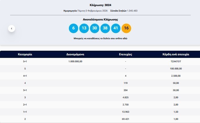 Ολοκληρώθηκε η κλήρωση του τζόκερ που πραγματοποιήθηκε σήμερα Πέμπτη, 3 Φεβρουαρίου, με κέρδη 1 εκατ. ευρώ.