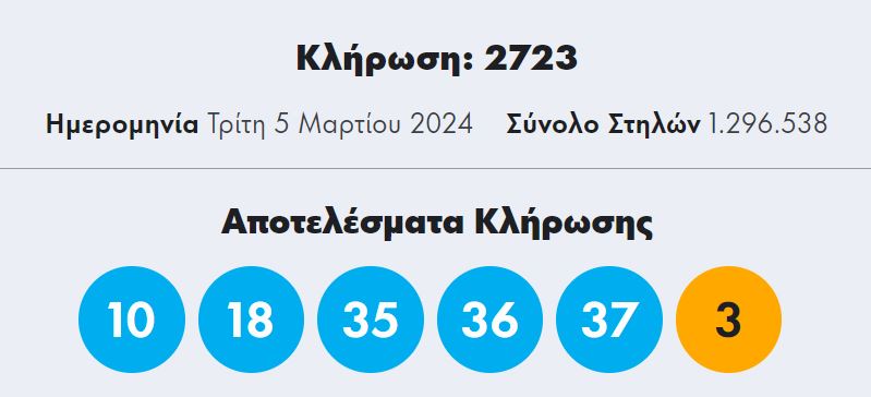 Oλοκληρώθηκε η κλήρωση 2723 του Τζόκερ που πραγματοποιήθηκε την Τρίτη 5 Μαρτίου 2024, με κέρδη πάνω από 1.200.000 ευρώ.