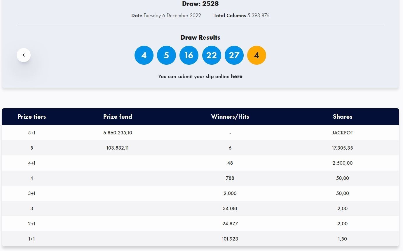 Οι τυχεροί αριθμοί που κληρώθηκαν είναι: 4, 5, 16, 22, 27.