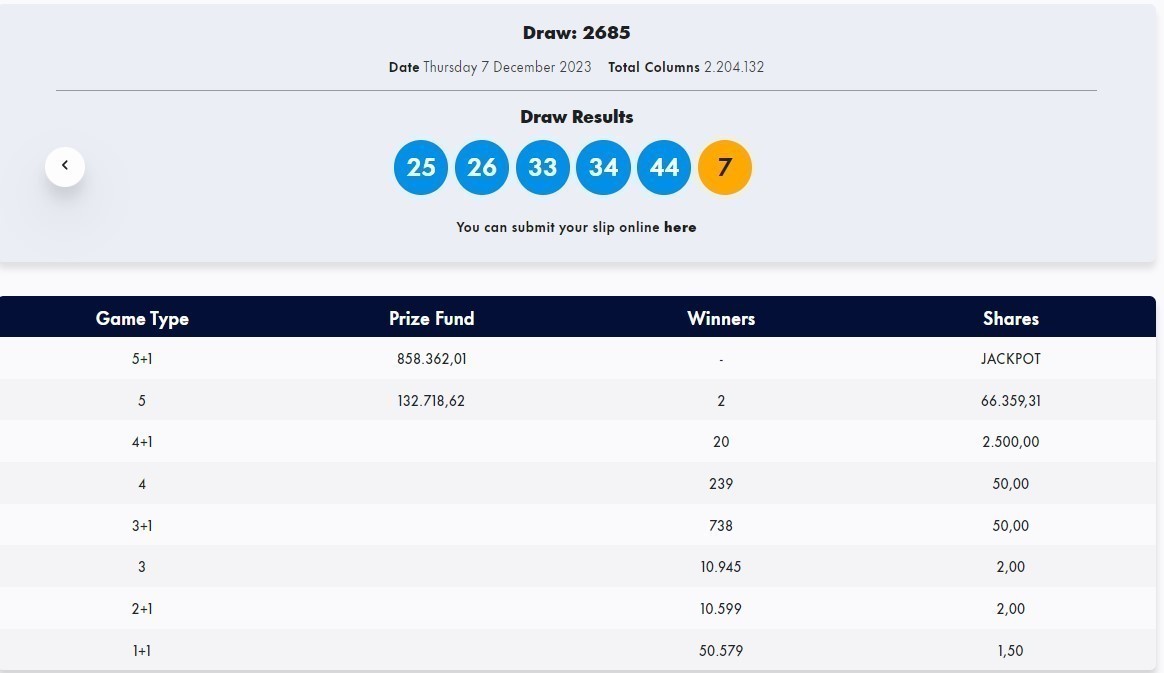 Οι τυχεροί αριθμοί στην κλήρωση Τζόκερ ήταν οι αριθμοί 25, 26, 33, 34, 44 και τζόκερ «βγήκε» ο αριθμός 7.