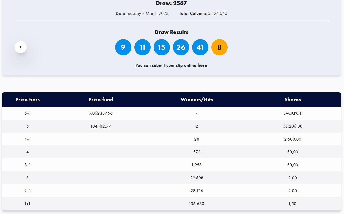 Ολοκληρώθηκε η κλήρωση (2567) του Τζόκερ που πραγματοποιήθηκε την Τρίτη 7 Μαρτίου 2023 και μοίραζε 7.062.187 ευρώ στους νικητές της πρώτης κατηγορίας.