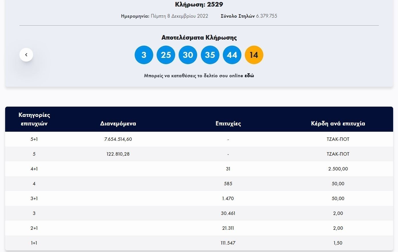 Οι τυχεροί αριθμοί που κληρώθηκαν είναι: 3, 25, 30, 35, 44