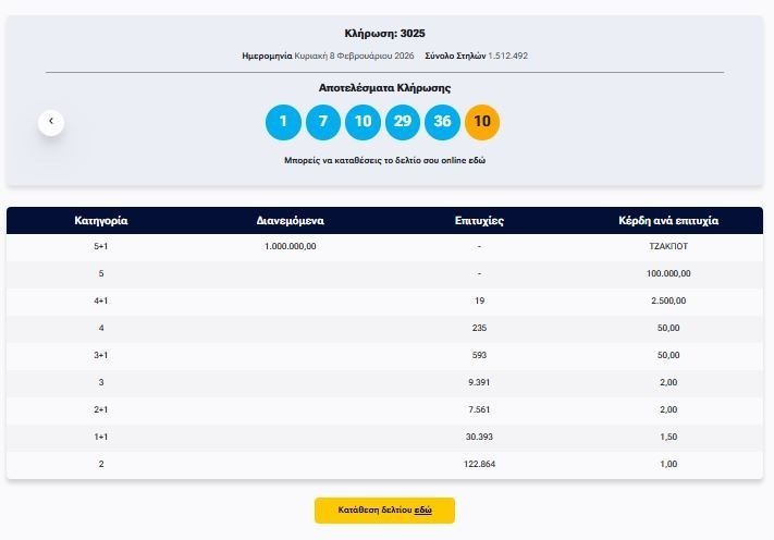 Ολοκληρώθηκε η κλήρωση του τζόκερ που πραγματοποιήθηκε σήμερα Κυριακή, 8 Φεβρουαρίου, με κέρδη 1 εκατ. ευρώ.