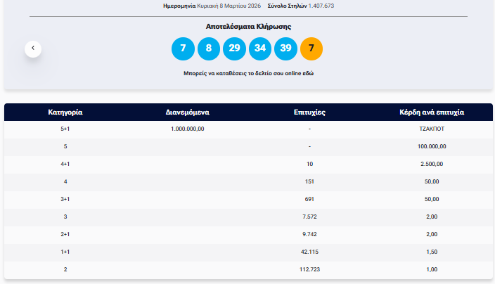 Ολοκληρώθηκε η κλήρωση του τζόκερ που πραγματοποιήθηκε σήμερα Κυριακή, 8 Μαρτίου, με κέρδη πάνω από 1 εκατ. ευρώ.