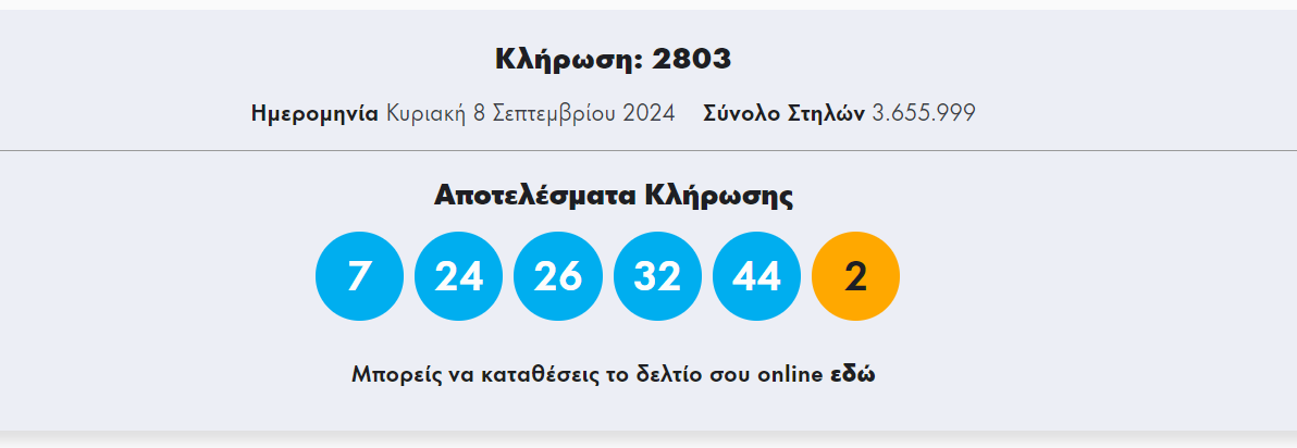 Οι τυχεροί αριθμοί στην κλήρωση Τζόκερ σήμερα είναι οι 7, 24, 26, 32, 44 και τζόκερ ο αριθμός 2.