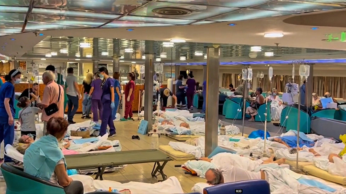 Στον εξωτερικό χώρο έχουν στηθεί τέντες για τα σοβαρά περιστατικά ενώ τα καταστρώματα του πλοίου έχουν μετατραπεί σε θαλάμους. Η προσπάθεια από γιατρούς, νοσηλευτές και δεκάδες διασώστες που μεταφέρουν συνέχεια ασθενείς είναι υπεράνθρωπη.