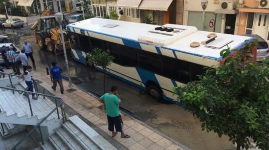 Σύμφωνα με πληροφορίες ενώ το λεωφορείο κινούνταν στο δρόμο υποχώρησε το οδόστρωμα με αποτέλεσμα το βαρύ όχημα να «βουλιάξει».