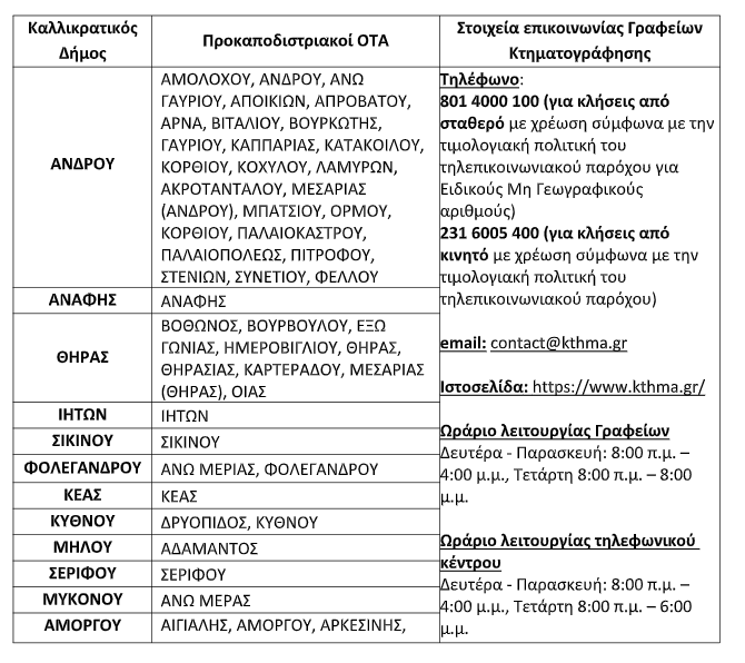 Ξεκινά την Τρίτη 24 Σεπτεμβρίου 2024 η διαδικασία Προανάρτησης κτηματολογικών στοιχείων για όσους δήλωσαν την ακίνητη περιουσία τους σε περιοχές των Καλλικρατικών Δήμων Άνδρου, Ανάφης, Θήρας, Ίου, Σικίνου, Φολεγάνδρου, Κέας, Κύθνου, Μήλου, Σερίφου, Μυκόνου, Αμοργού, Νάξου & Μικρών Κυκλάδων, Αντιπάρου, Πάρου και Τήνου, της Περιφέρειας Νοτίου Αιγαίου.
