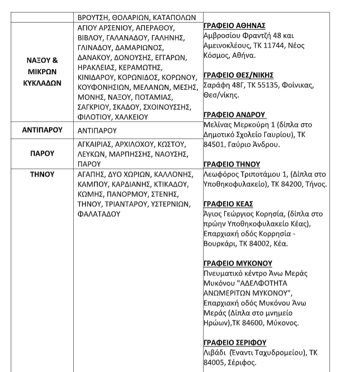 Ακολουθούν οι περιοχές και τα στοιχεία επικοινωνίας: