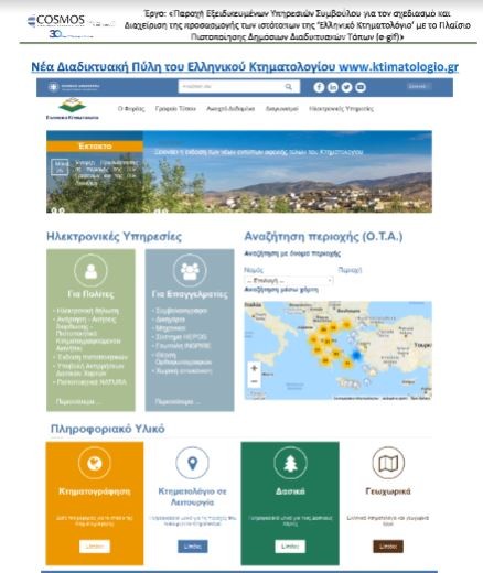 Μετά την ολοκλήρωση του σχετικού έργου Ψηφιακού Μετασχηματισμού το οποίο υλοποίησε η Cosmos Business Systems AEBE, βρίσκεται σε πλήρη λειτουργία η νέα Διαδικτυακή Πύλη του Ελληνικού Κτηματολογίου στην διεύθυνση: www.ktimatologio.gr που πιο συγκεκριμένα αφορά την «Παροχή Εξειδικευμένων Υπηρεσιών Συμβούλου για τον σχεδιασμό και Διαχείριση της προσαρμογής των ιστότοπων της «Ελληνικό Κτηματολόγιο» με το Πλαίσιο Πιστοποίησης Δημόσιων Διαδικτυακών Τόπων (e-gif)».
