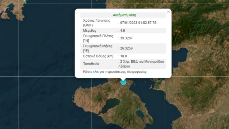 Σεισμική δόνηση μεγέθους 4,9 βαθμών της κλίμακας Ρίχτερ, η οποία χαρακτηρίζεται «ασθενής», σημειώθηκε στις 03:52 σήμερα στη Λέσβο, όπως ανακοίνωσε το Γεωδυναμικό Ινστιτούτο του Εθνικού Αστεροσκοπείου Αθηνών εκ μέρους των τεσσάρων φορέων συγκρότησης του Ενιαίου Εθνικού Σεισμολογικού Δικτύου.