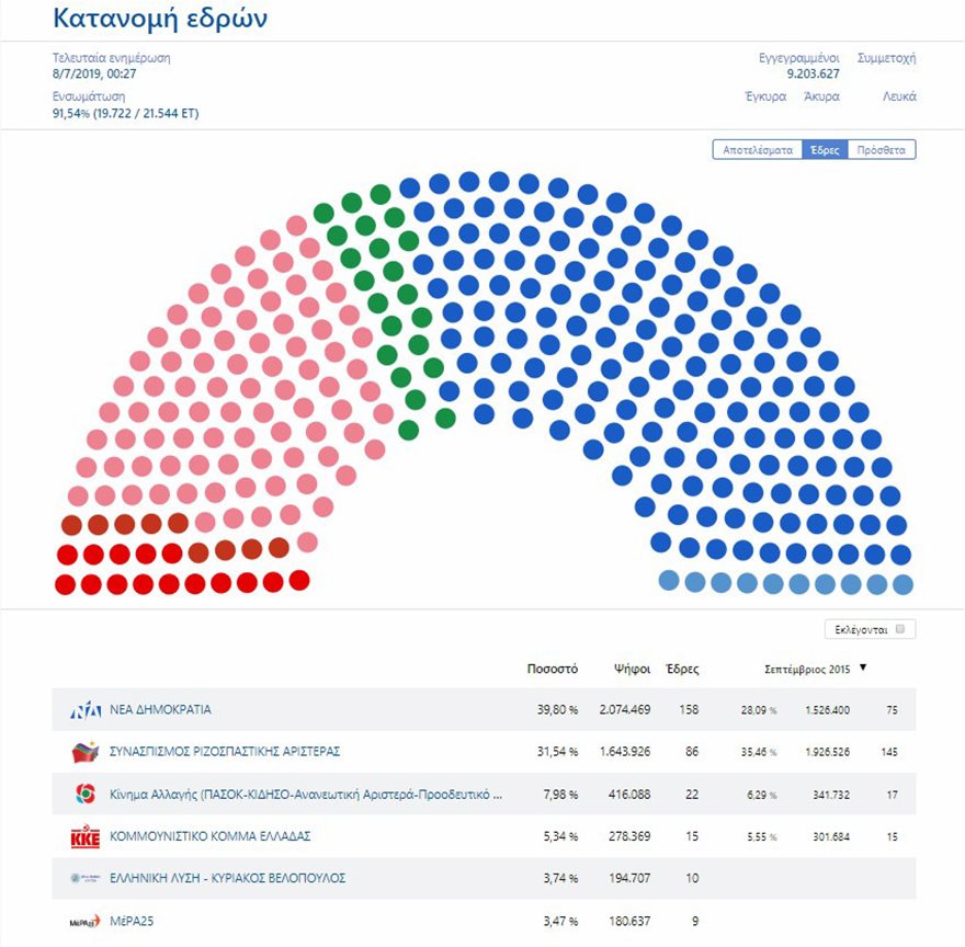 Πιο αναλυτικά, το κόμμα της Νέας Δημοκρατίας είναι κατά 83 έδρες ενισχυμένο μετά την νίκη στις εθνικές εκλογές του 2019 έναντι του αριθμού των εδρών στις εκλογές του Σεπτεμβρίου του 2015. Ο ΣΥΡΙΖΑ που καταλαμβάνει 86 έδρες στη Βουλή έχασε 59 έδρες σε σχέση με το 2015. Ενισχυμένο κατά 5 έδρες βγήκε το ΚΙΝ.ΑΛ που καταλαμβάνει 22 έδρες, ενώ το ΚΚΕ έχασε μια έδρα σε σχέση με το 2015, εξασφαλίζοντας 14. Το νεοεισερχόμενο κόμμα Ελληνική Λύση καταλαμβάνει 10 έδρες, ενώ το ΜεΡΑ 25 του Γιάνη Βαρουφάκη καταλαμβάνει 9 έδρες.