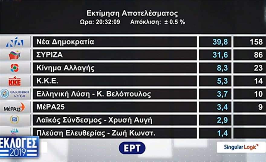 - Singular: ΝΔ με 39,8% και εώς 158 έδρες – ΣΥΡΙΖΑ 31,6% – Δείτε αναλυτικά την πρώτη εκτίμηση αποτελέσματος