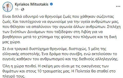 «Είναι διπλά οδυνηρό να θρηνούμε ζωές που χάθηκαν σώζοντας ζωές. Και ταυτόχρονα να αγωνιούμε για την υγεία ανθρώπων μας, που θέλησαν να απαλύνουν την αγωνία άλλων ανθρώπων. Στελέχη των Ενόπλων Δυνάμεων που ταξίδεψαν στη Λιβύη για να βοηθήσουν μετά το χτύπημα της φύσης που πλήγωσε και τη δική μας χώρα.