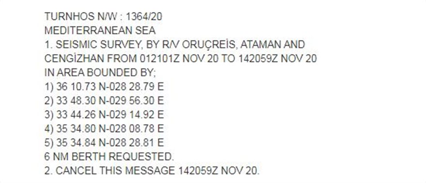 Η νέα NAVTEX, αφορά και τα συνοδευτικά του τουρκικού ερευνητικού Αταμάν και Τζένγκις Χαν και έχει χρονική διάρκεια από σήμερα 1 Νοεμβρίου μέχρι τις 14 Νοεμβρίου.