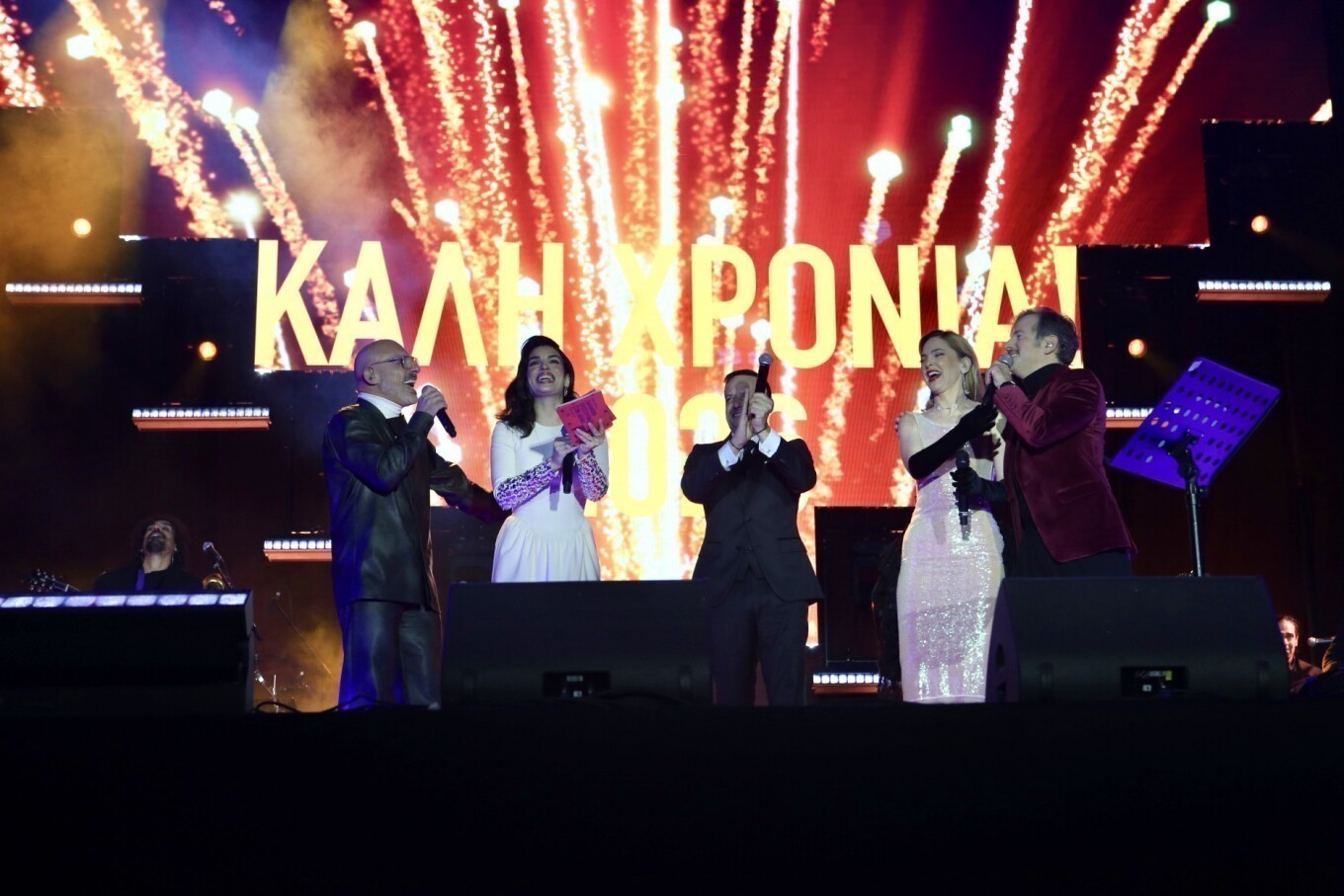Όταν έφτασε η ώρα για την αλλαγή του χρόνου, ο δήμαρχος Αθηναίων Χάρης Δούκας ανέβηκε στη σκηνή της πλατείας, ευχήθηκε για τη νέα χρονιά, μίλησε για «την Αθήνα που ενώνει» και μαζί με τους καλλιτέχνες έκανε την αντίστροφη μέτρηση για τον ερχομό του 2026.