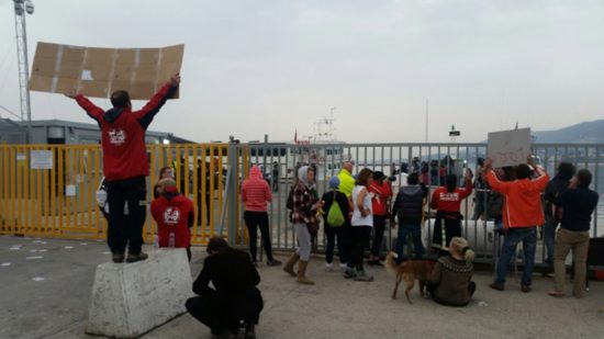 Από νωρίς το πρωί έχουν συγκεντρωθεί στο λιμάνι της Λέσβου αλληλέγγυοι οι οποίοι διαμαρτύρονται για τις επαναπροωθήσεις. Μάλιστα τρεις από αυτούς βούτηξαν στην θάλασσα προκειμένου να εμποδίσουν την αναχώρηση του πλοίου. Η αστυνομία, σύμφωνα με πληροφορίες, προχώρησε μάλιστα στην προσαγωγή ενός διαδηλωτή.