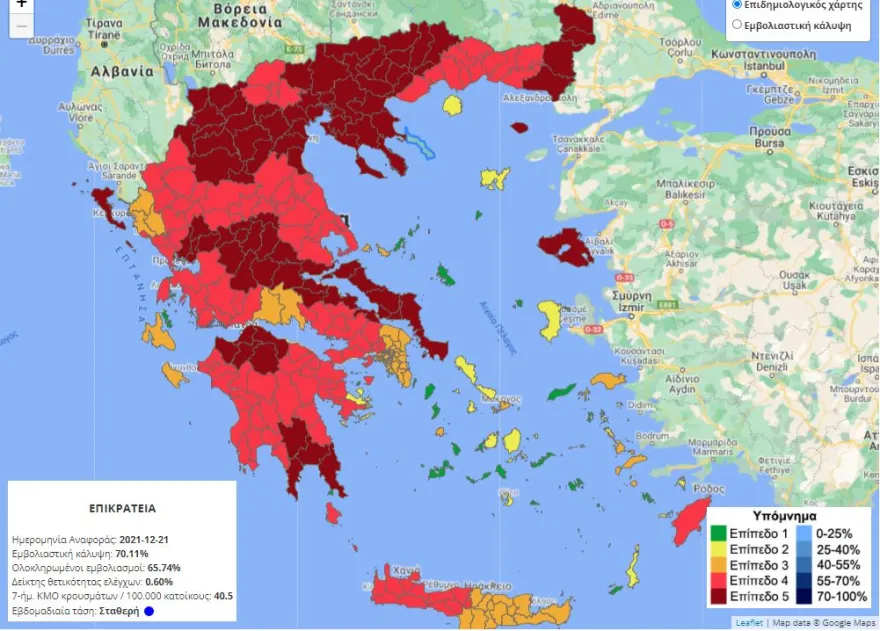 Σύμφωνα με τον επιδημιολογικό χάρτη οι περιοχές που είναι στο «βαθύ κόκκινο» στη χώρα μας είναι συνολικά 20.