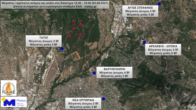 Όταν το πύρινο μέτωπο πλησίασε στην περιοχή που είναι εγκατεστημένος ο αυτόματος μετεωρολογικός σταθμός του Τατοΐου, καταγράφηκε απότομη αύξηση της ταχύτητας του ανέμου από 6 σε 20 χλμ./ώρα και της θερμοκρασίας από 40 σε 45 βαθμούς Κελσίου.