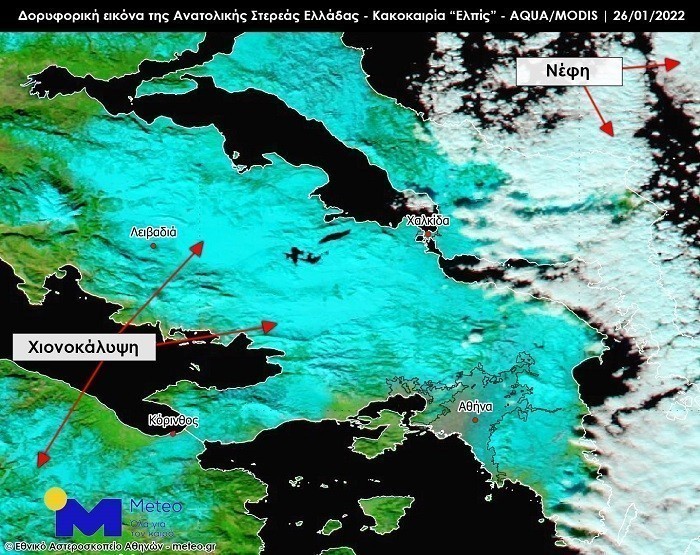 Με βάση μια εικόνα που ελήφθη το μεσημέρι της Τετάρτης από το όργανο MODIS του αμερικανικού περιβαλλοντικού δορυφόρου Aqua, υπολογίστηκε από το Εθνικό Αστεροσκοπείο Αθηνών – meteo.gr ότι η επιφάνεια των χιονοκαλυμμένων περιοχών είναι μεγαλύτερη από 6.000 τετραγωνικά χιλιόμετρα.