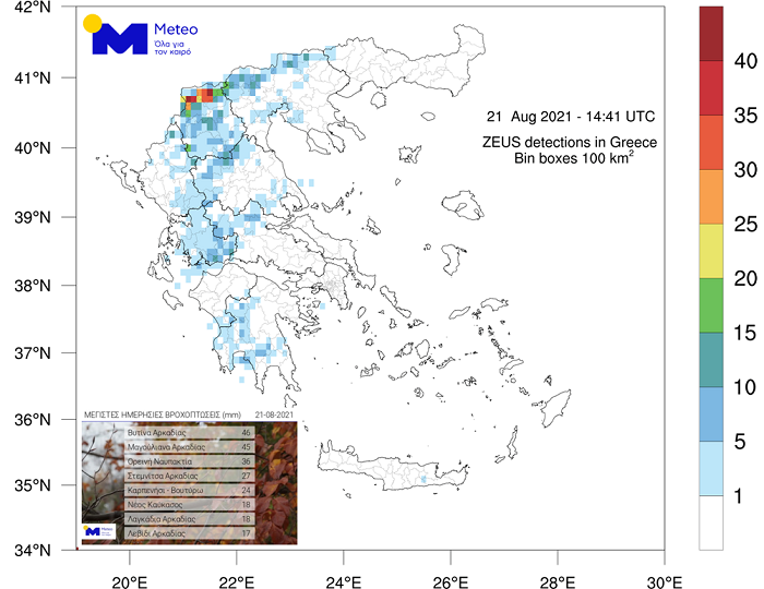 Στο σχετικό σχήμα παρουσιάζεται η πυκνότητα κεραυνών (με κόκκινες αποχρώσεις οι περιοχές με τη μεγαλύτερη πυκνότητα κεραυνών), ενώ στον ένθετο πίνακα φαίνονται οι οκτώ σταθμοί του δικτύου με τα μεγαλύτερα ύψη βροχής έως το απόγευμα του Σαββάτου.