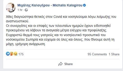 «Χθες διαγνώστηκα θετικός στον Covid και νοσηλεύομαι λόγω λοίμωξης του αναπνευστικού. Οι συνεργάτες και οι επαφές των τελευταίων ημερών έχουν ειδοποιηθεί προκειμένου να λάβουν τα αναγκαία μέτρα ελέγχου και προφύλαξης», αναφέρει ο ίδιος ο κ. Καλογήρου στον προσωπικό λογαριασμό του στο Facebook, όπου προσθέτει: