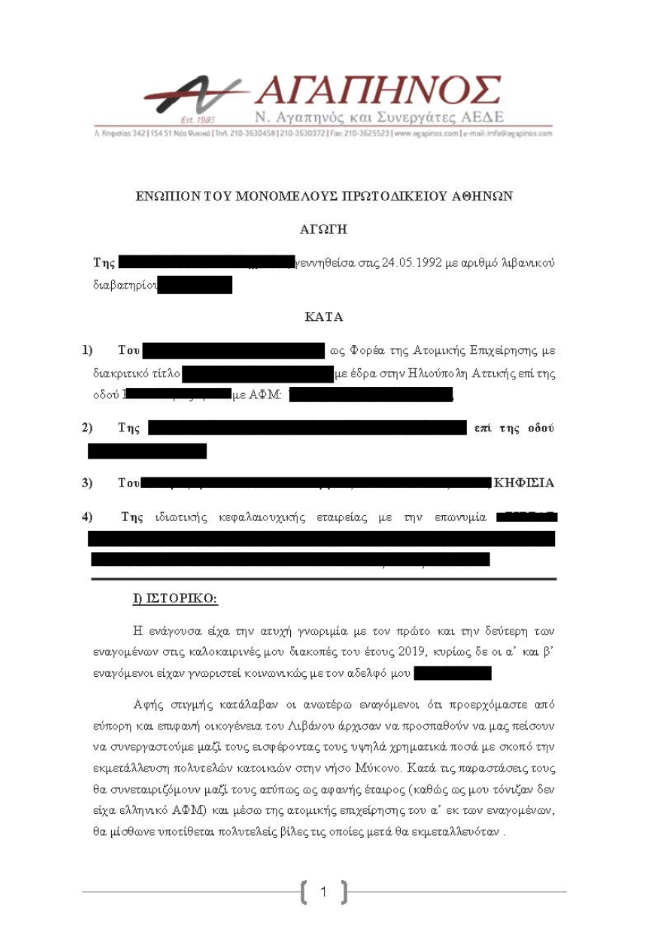 «Πράγματι μετά από συνεχείς πιέσεις προς εμένα και τον αδερφό μου με παρέπεισαν την 02/12/19 δυστυχώς και τους παρέδωσα από τις προσωπικές μου αποταμιεύσεις το ποσό των 40.000 ευρώ με σκοπό να χρησιμοποιηθούν για την μίσθωση ακινήτου» αναφέρει η αγωγή της.
