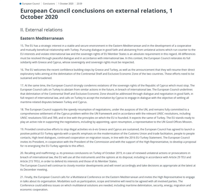 «Επιπλέον, καθίσταται σαφές ότι οι διερευνητικές επαφές μεταξύ Ελλάδας – Τουρκίας αφορούν την Οριοθέτηση Θαλάσσιων ζωνών (Υφαλοκρηπίδα – ΑΟΖ). Είναι σαφές πως για πρώτη φορά η συμπεριφορά της Τουρκίας έναντι της Ελλάδας και της Κύπρου βρέθηκε στο επίκεντρο μιας μαραθώνιας συνεδρίασης της Συνόδου Κορυφής και δεν αποτέλεσε απλά ως ένα μέρος της υπό συζήτηση ατζέντας» συμπλήρωναν οι ίδιες πηγές τονίζοντας την απερίφραστη καταδίκη από τη Σύνοδο Κορυφής της παραβίασης των κυριαρχικών δικαιωμάτων της Κύπρου και την ρητή αναφορά στις αποφάσεις και στα ψηφίσματα του Συμβουλίου Ασφαλείας του ΟΗΕ για την επίλυση του Κυπριακού.