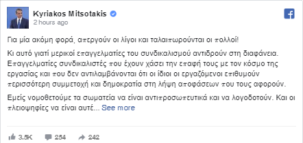 Ο πρωθυπουργός παρενέβη στις απεργιακές κινητοποιήσεις της Τετάρτης, με ανάρτησή του στο Facebook, στην οποία ξεκαθαρίζει πως «για μία ακόμη φορά, απεργούν οι λίγοι και ταλαιπωρούνται οι πολλοί!».