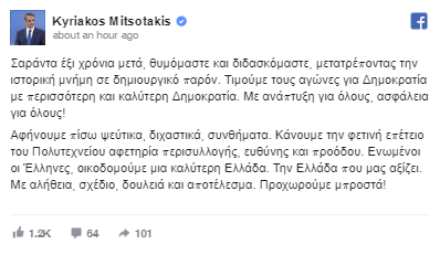Ο κ. Μητσοτάκης σημειώνει «αφήνουμε πίσω ψεύτικα, διχαστικά, συνθήματα. Κάνουμε την φετινή επέτειο του Πολυτεχνείου αφετηρία περισυλλογής, ευθύνης και προόδου. Ενωμένοι οι Έλληνες, οικοδομούμε μια καλύτερη Ελλάδα. Την Ελλάδα που μας αξίζει. Με αλήθεια, σχέδιο, δουλειά και αποτέλεσμα. Προχωρούμε μπροστά!».