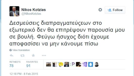 Μήνυμα ότι η κυβέρνηση είναι αποφασισμένη να μην υποχωρήσει απέναντι στους δανειστές στέλνει ο υπουργός Εξωτερικών Νίκος Κοτζιάς μέσω Twitter.