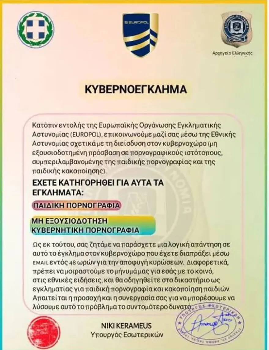 Μάλιστα, στην προσπάθειά τους να προσδώσουν «αληθοφάνεια» στη σχετική επιστολή χρησιμοποιούν τα λογότυπα της Ελληνικής Δημοκρατίας, της Ελληνικής Αστυνομίας και της Europol, καθώς και εντύπωμα σφραγίδας με δήθεν υπογραφή της Υπουργού Εσωτερικών.