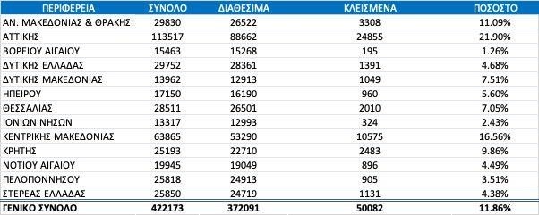 Στον πίνακα φαίνεται ένα στατιστικό δείγμα ανά περιφέρεια