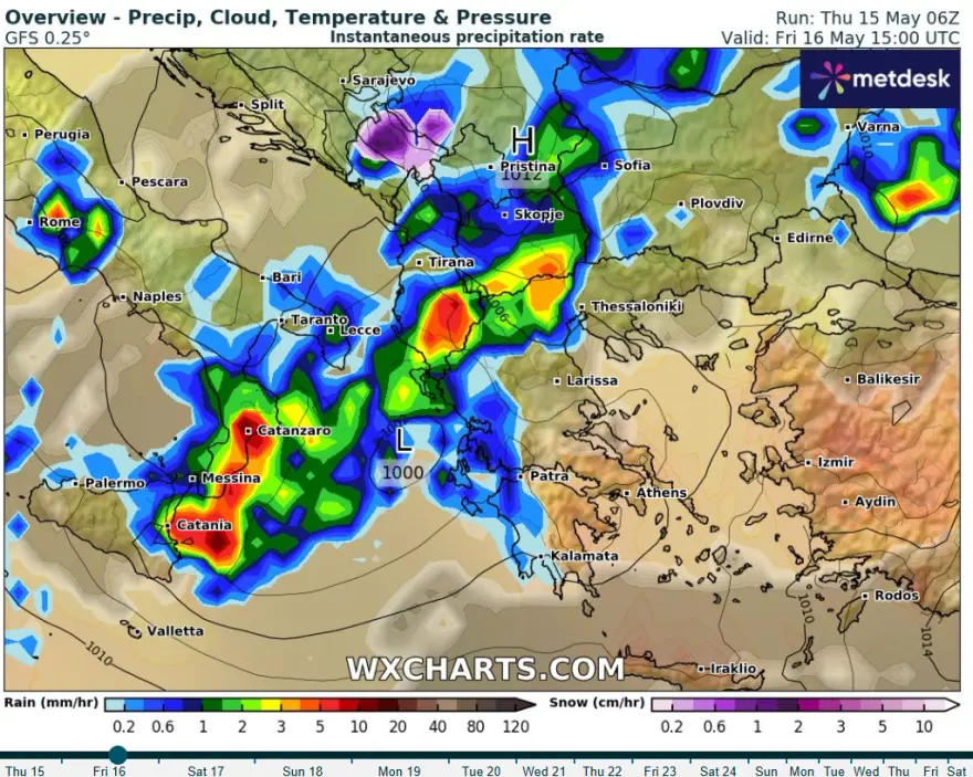 Σύμφωνα με τα προγνωστικά στοιχεία του meteo.gr / Εθνικού Αστεροσκοπείου Αθηνών, την Παρασκευή 16/05 αναμένονται βροχές (με κατά τόπους λασποβροχές), τοπικά θυελλώδεις νοτιοανατολικοί άνεμοι στο Αιγαίο και πολύ αυξημένες συγκεντρώσεις Αφρικανικής σκόνης στα νότια.