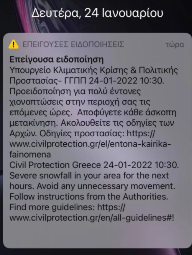 Προειδοποίηση για πολύ έντονες χιονοπτώσεις στην περιοχή σας τις επόμενες ώρες. Αποφύγετε κάθε άσκοπη μετακίνηση. Ακολουθείτε τις οδηγίες των Αρχών», έγραφε το μήνυμα που εστάλη.