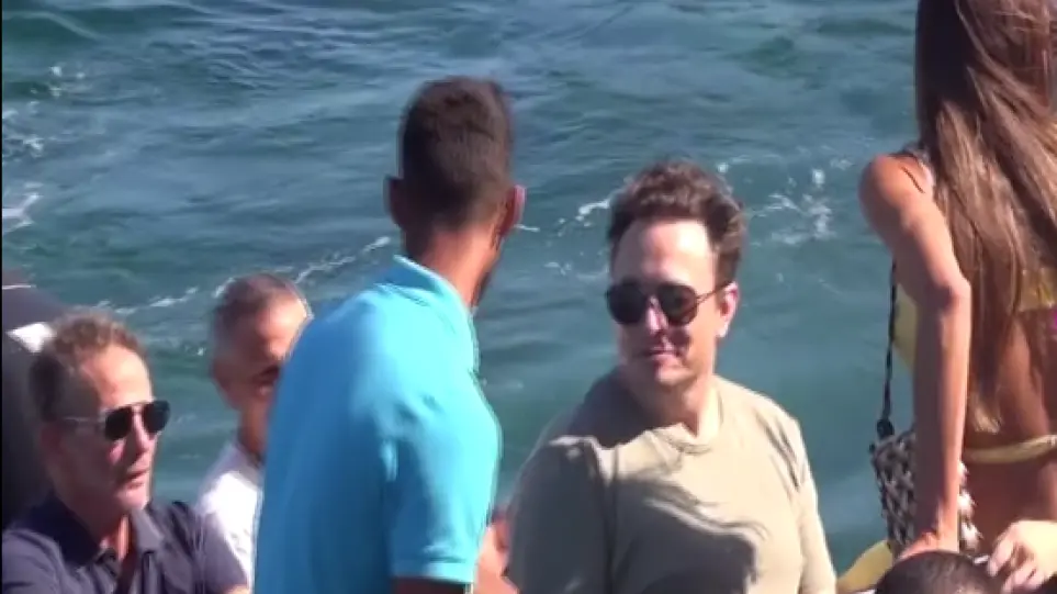 Η κάμερα του Mykonos Live TV «έπεσε πάνω» στον ιδιοκτήτη της Tesla την ώρα που αποχωρούσε διά θαλάσσης από το γνωστό εστιατόριο Spilia στην περιοχή της Αγίας Άννας συνοδευόμενος από την καλλονή σύντροφό του, Νατάσα Μπάσετ και έχοντας γύρω του πολλούς σεκιούριτι, ένας από τους οποίους κρατούσε στα χέρια του ένα μεγάλο μπουκάλι ροζέ κρασί γνωστής γαλλικής ετικέτας.