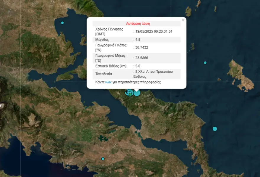 Νωρίτερα η Αυτόματη Λύση του Γεωδυναμικού Ινστιτούτου είχε δώσει το επίκεντρο της δόνησης 8 χλμ ανατολικά του Προκοπίου Ευβοίας και το εστιακό βάθος στα 5 χλμ.