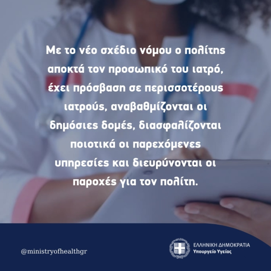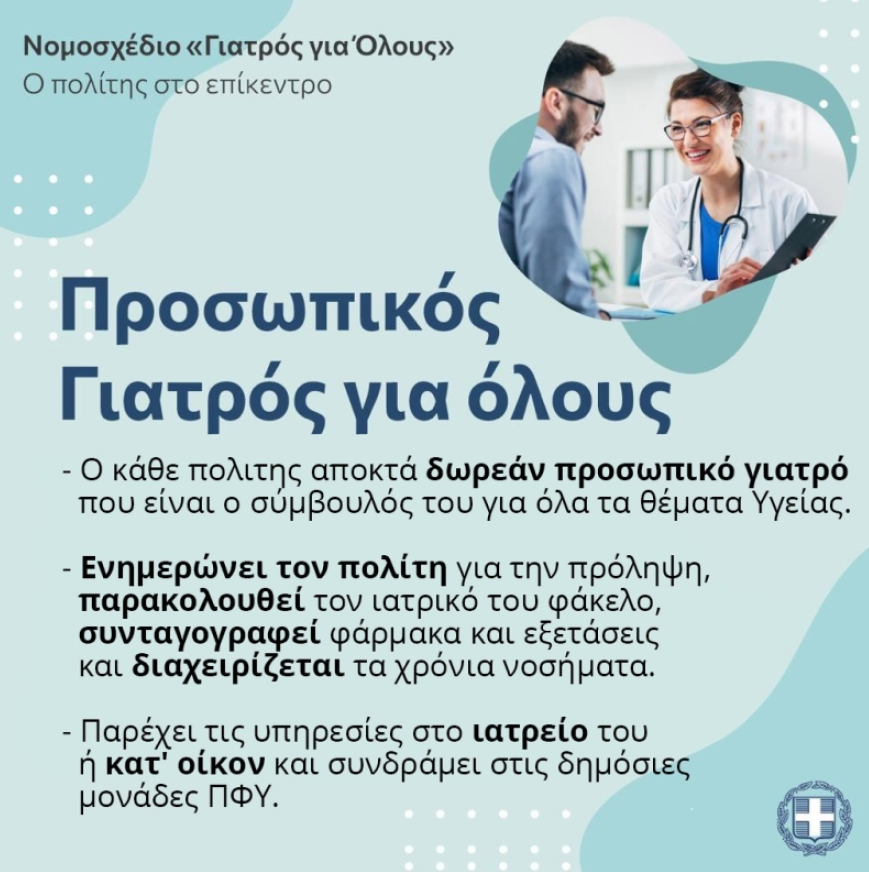 Ο προσωπικός γιατρός για κάθε πολίτη στη χώρα, είναι πλέον γεγονός. Ο γιατρός θα επιλέγεται ελεύθερα από τον πολίτη, θα είναι είτε γιατρός του ΕΣΥ, είτε ιδιώτης, είτε συμβεβλημένος με τον ΕΟΠΥΥ, είτε γιατρός που υπηρετεί σε μονάδες και Κέντρα Υγείας της ΠΦΥ.