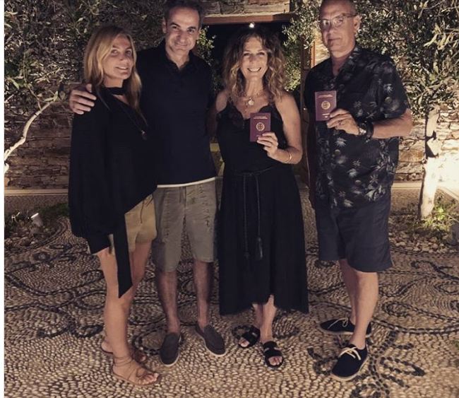 Φωτογραφία με τα… ελληνικά διαβατήρια ανά χείρας, έβγαλαν ο Τομ Χανκς και η συζύγος του Ρίτα Γουίλσον με τον Κυριάκο Μητσοτάκη και τη σύζυγό του Μαρέβα.