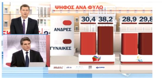 Ο ΣΥΡΙΖΑ και ο Αλέξης Τσίπρας κέρδισε τις γυναίκες ψηφοφόρους αφού το 38,2% των γυναικών ψηφοφόρων ψήφισαν ΣΥΡΙΖΑ, ενώ αντίστοιχα το 30,4% των ανδρών ψηφοφόρων ψήφισαν το κόμμα του Αλέξη Τσίπρα.
