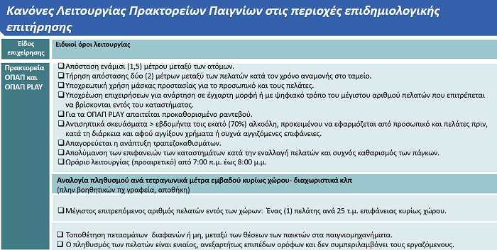 Σημειώνεται, πως τα πρακτορεία του ΟΠΑΠ παραμένουν κλειστά στις «κόκκινες» επιδημιολογικά περιοχές στις οποίες συγκαταλέγεται και η Αττική.