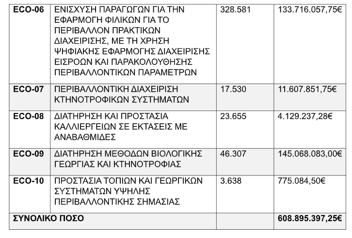 • Προγράμματα για το κλίμα, το περιβάλλον και την καλή διαβίωση των ζώων (οικολογικά προγράμματα) – 443.863 ΠΑΡΑΓΩΓΟΙ – 425.070.974 ΕΥΡΩ